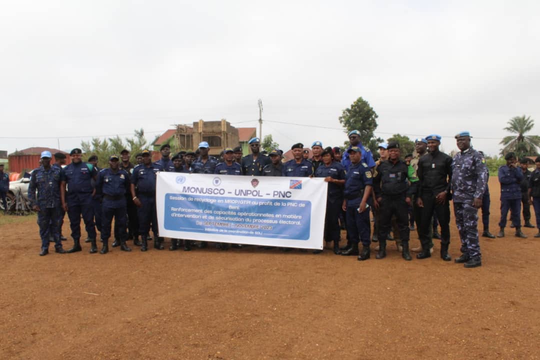 Environ 1000 éléments de la police nationales congolaise venus des différentes unités participent à une session de recyclage en Maintien et Rétablissement de l’Ordre Public, Gestes Techniques Professionnels d’intervention, MROP/GTPI dans la ville de Beni à partir de ce lundi 4 septembre 2023. Cette session est chapeautée par la police des Nations-Unies, UNPOL.
