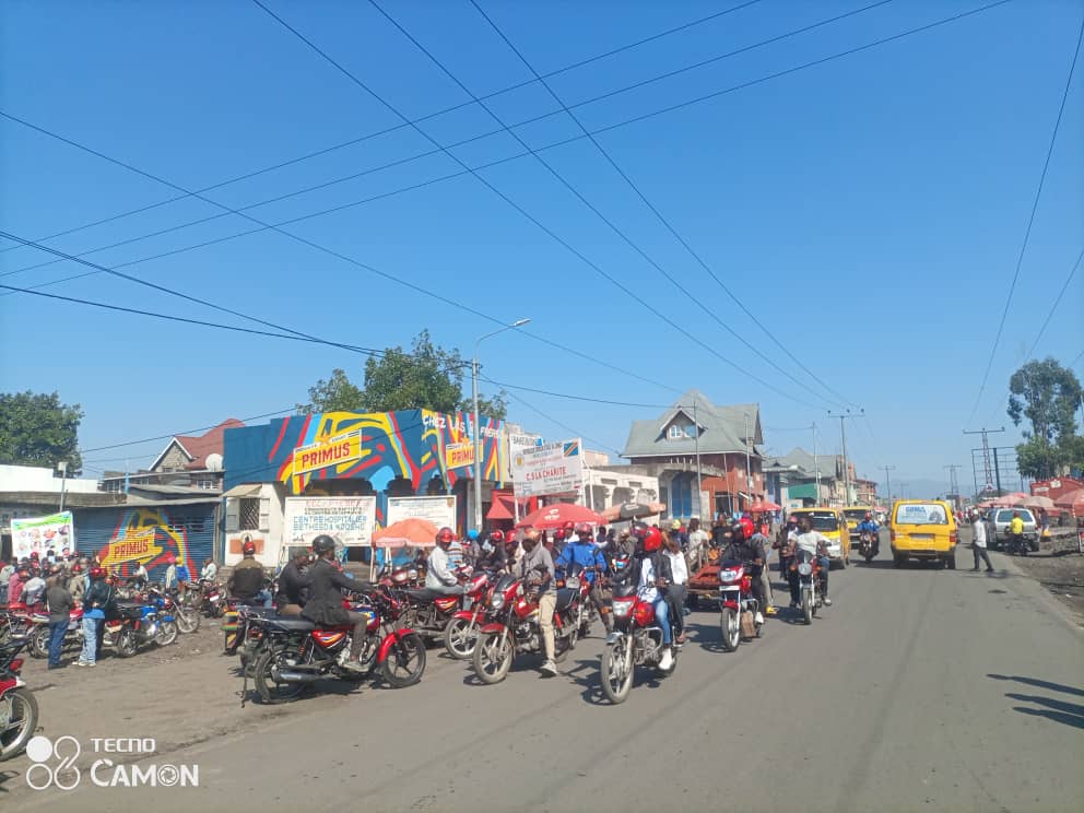 Déjà très tôt matin, les bleus blancs étaient visibles sur la route principale Goma saké. Le transport en commun fonctionne correctement. Les entités réputées pro manifestants semblent calmes.