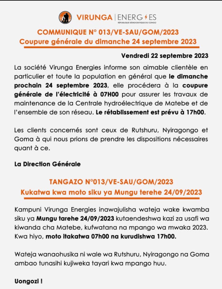 » La société Virunga énergie informe son aimable clientèle en particulier et tous les habitants en général que dimanche 24 septembre 2023, elle procédera à la coupure générale de l’électricité à partir de 7h. »