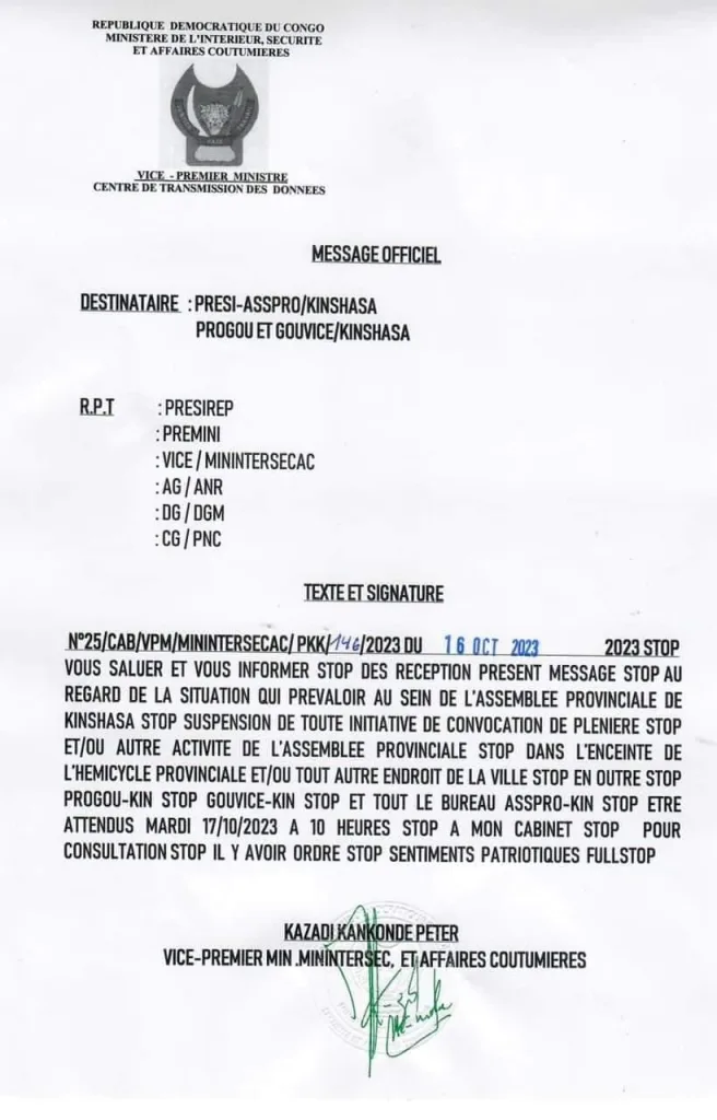 Le Vice-premier ministre, Ministre de l’Intérieur et Sécurité, vient de signer un télégramme portant suspension de toute initiative de convocation de plénière de l’assemblée provinciale de Kinshasa jusqu’à nouvel ordre.