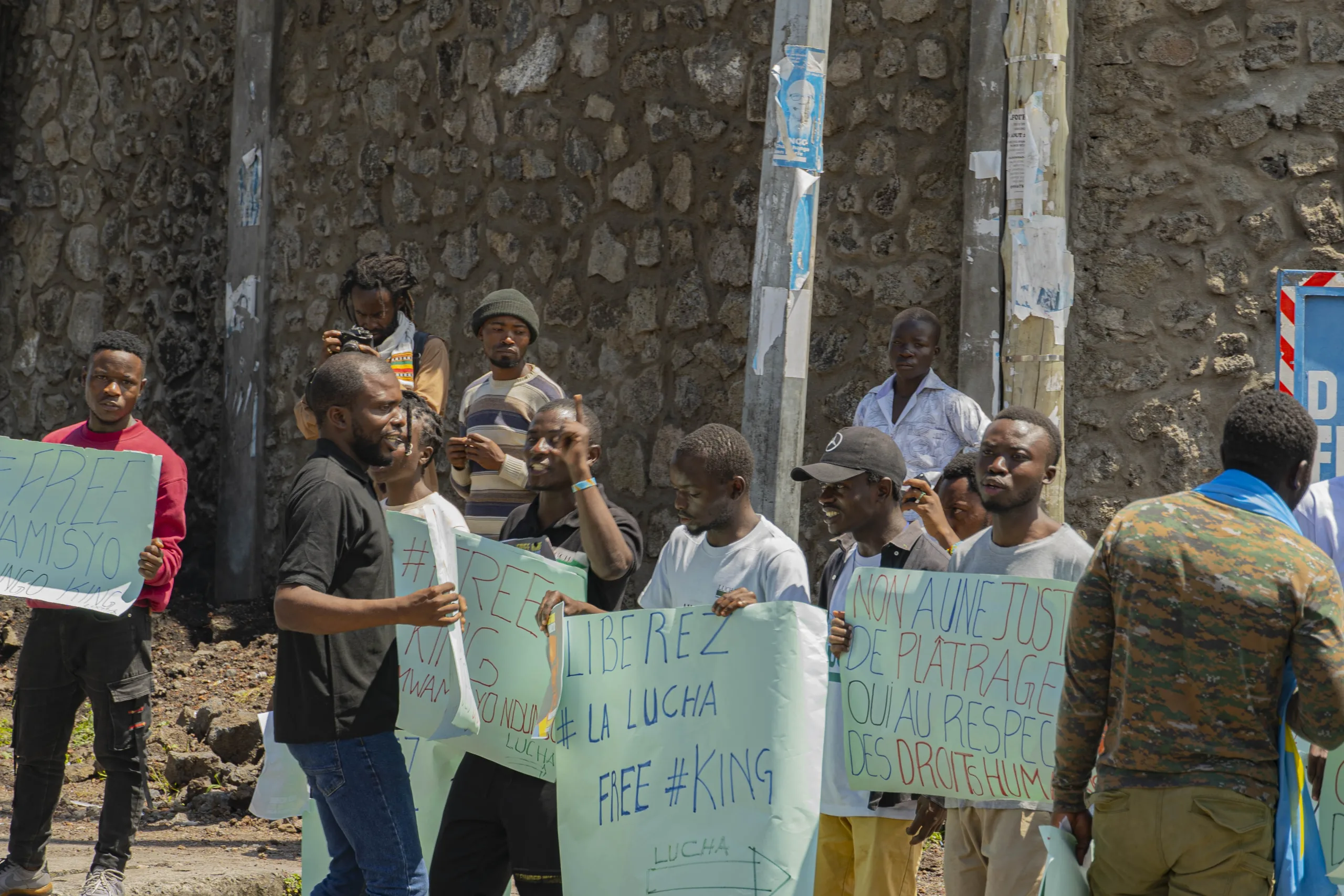 « Aujourd’hui marque deux ans depuis l’incarcération injuste de MWAMISYO KING. Il s’agit d’un jeune étudiant qui a été arrêté sans mandat simplement pour avoir critiqué l’état de siège. Nous demandons aux autorités de traquer les rebelles et de laisser les activistes exercer librement leur droit à la liberté d’expression. Nous sommes ici au gouvernorat pour demander au gouverneur militaire de s’impliquer personnellement afin que ce jeune recouvre sa liberté », a déclaré Moise Hangi, militant de la Lucha, présent lors de la manifestation.