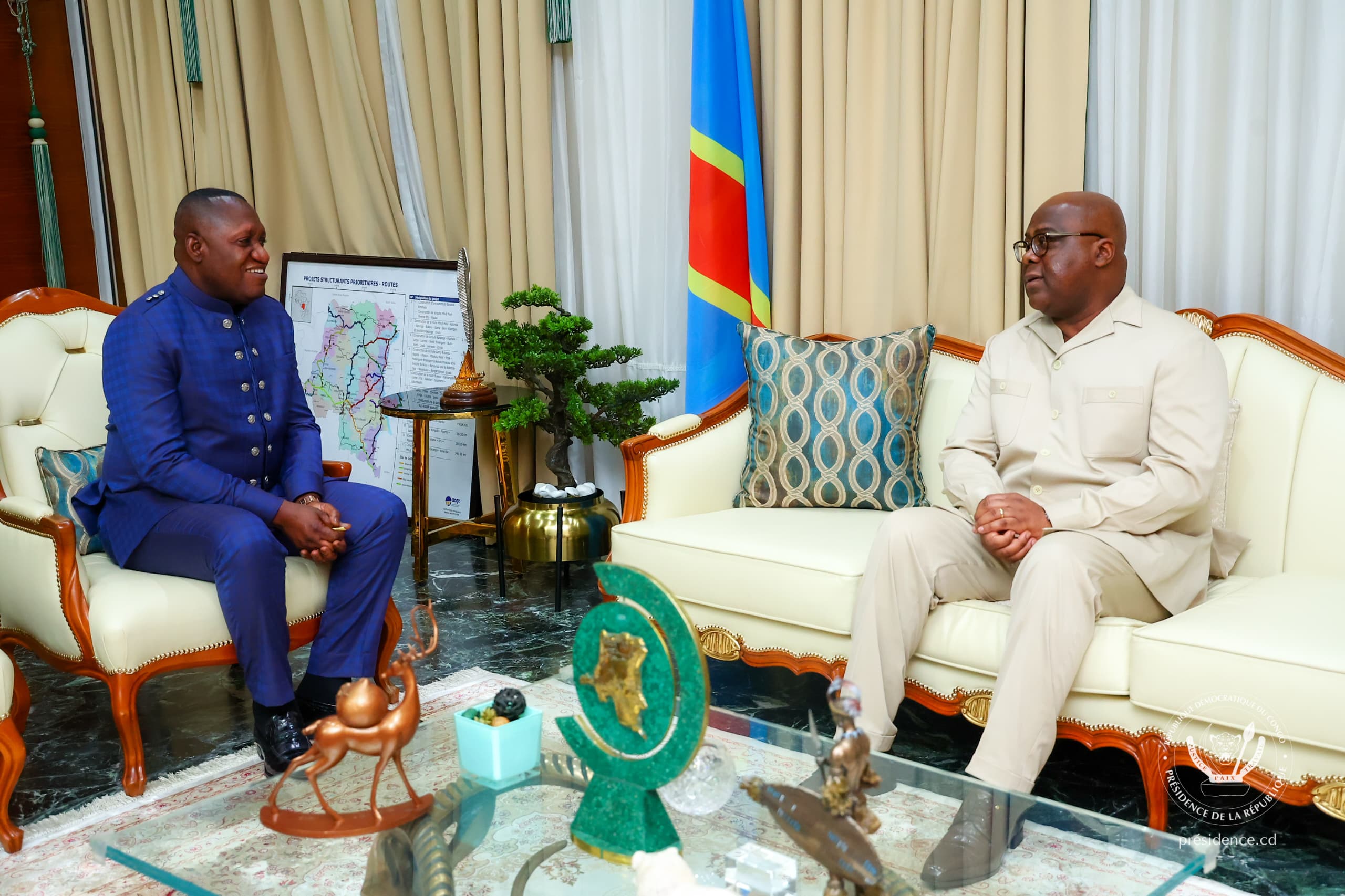 Le Président de la République a rencontré, mercredi 18 septembre 2024, à la Cité de l’Union Africaine à Kinshasa, Jules Alingete, Inspecteur Général de l’Inspection Générale des Finances (IGF), ainsi que Miguel Kashal Katemb, Directeur Général de l’Autorité de Régulation de la Sous-traitance dans le Secteur Privé (ARSP).